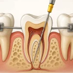 در این مرحله، دندانپزشک با بررسی عکس و انجام تست حیاتی بودن پالپ، وضعیت ریشه را ارزیابی میکند. اگر التهاب یا عفونت وجود داشته باشد، درمان ریشه انجام میشود تا دندان برای سالها سالم بماند. این موضوع هیچ تأثیری بر نتیجه نهایی ارتودنسی ندارد، اما از بروز درد یا عفونت آینده جلوگیری میکند.